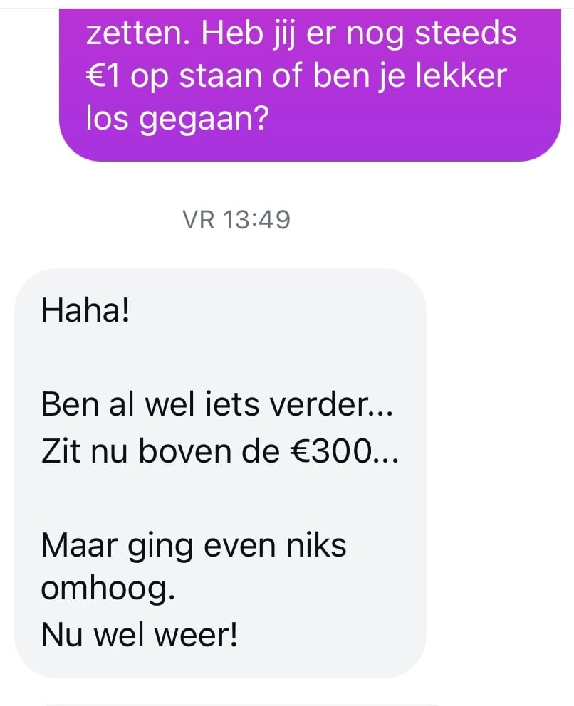 Jij baalt als een stekker, want als je gewoon gestart was met €1 dan had jouw vermogen ook veilig kunnen groeien. Met €1 heb je niks te verliezen. En toch win je er direct kennis en ervaring mee.