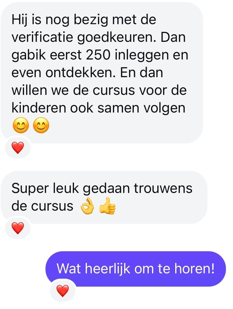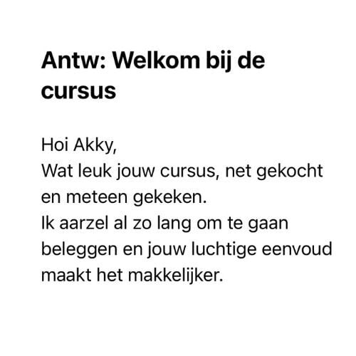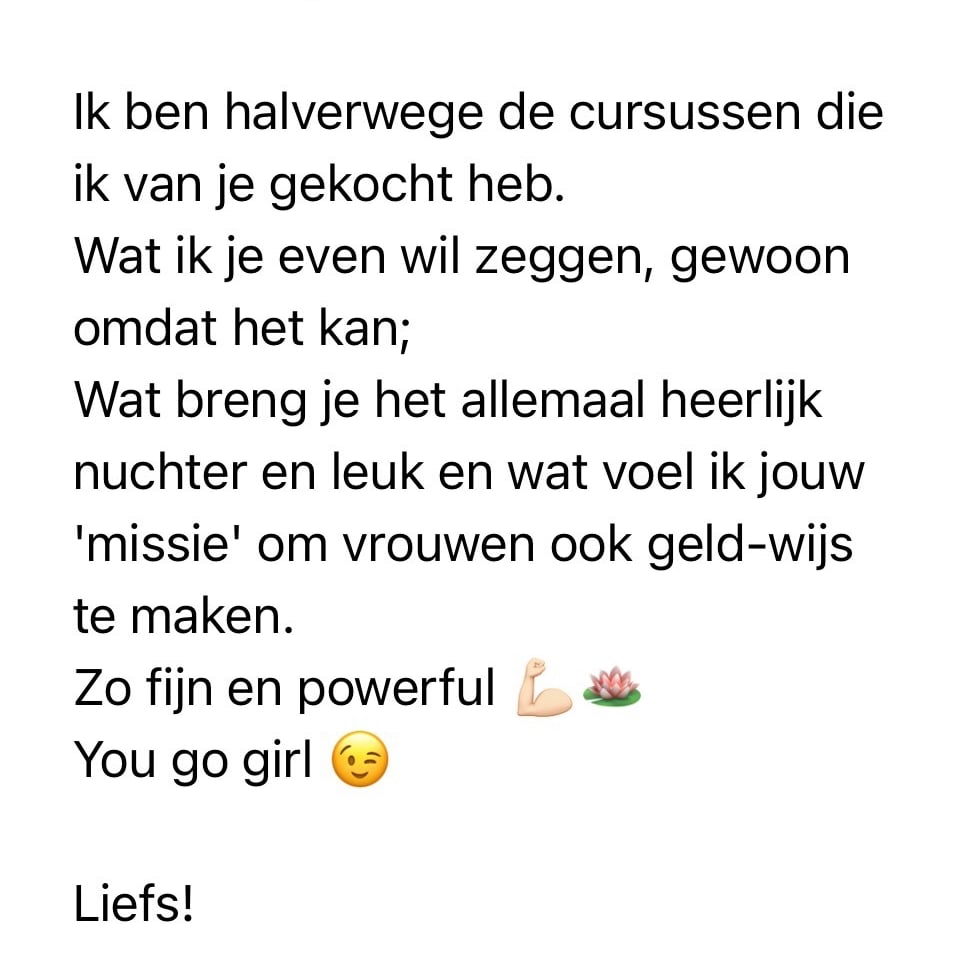 Ondertussen hielp ik al mijn vriendinnen en kennissen om te starten met beleggen, maar dat kostte me steeds enorm veel tijd. Daarom heb ik er een korte cursus over gemaakt. En nu genieten zij, en honderden klanten van deze eenvoudige stap die ze zoveel oplevert.