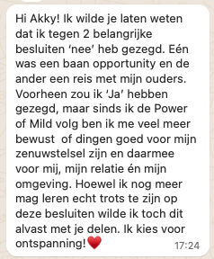 The Power of Mild is bedoeld als educatief en ervaringsgericht programma. Ik geef geen garanties over resultaten, manifestaties of inkomsten. Iedere deelnemer is verantwoordelijk voor haar eigen proces en toepassing. Door dit programma te kopen, ga je ermee akkoord dat er geen beloftes of toezeggingen zijn gedaan over jouw persoonlijke resultaten of financiële uitkomsten. Wat voor mij of andere deelnemers werkt, is geen garantie voor wat er bij jou zal ontstaan. Ik geloof in de kracht van zenuwstelselregulatie en de waarde van dit programma, maar jouw ervaring hangt af van talloze factoren, waaronder je achtergrond, inzet, dagelijkse realiteit en bereidheid om te oefenen. Er worden na 14 dagen na aankoop geen refunds gegeven. Alle aankopen zijn definitief.